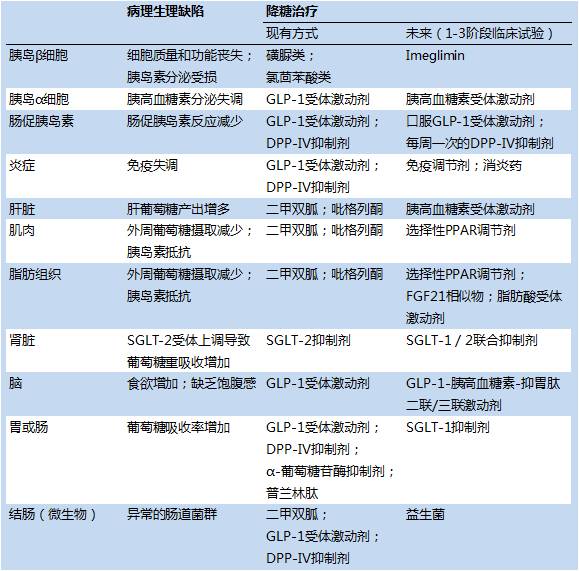 2型糖尿病的进展涉及全身诸多器官。许多器官的病理生理缺陷都已经成为了现有和新型药物研发的靶点,例如:胰高血糖素分泌失调、肠促胰素反应减少、免疫失调、肾脏SGLT2受体上调等(见表1)。